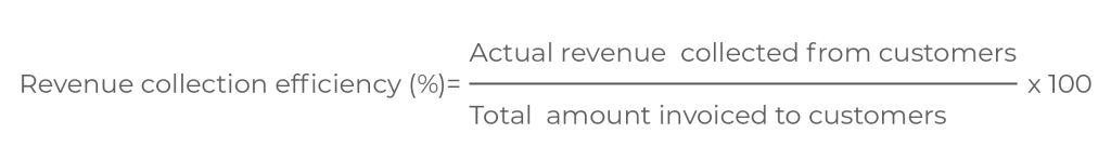 Revenue collection is a key factor in sustaining the utility financial performance. Revenue collection efficiency is a key performance indicator that shows the utility’s ability to collect revenue from the billed revenue. It is calculated as: