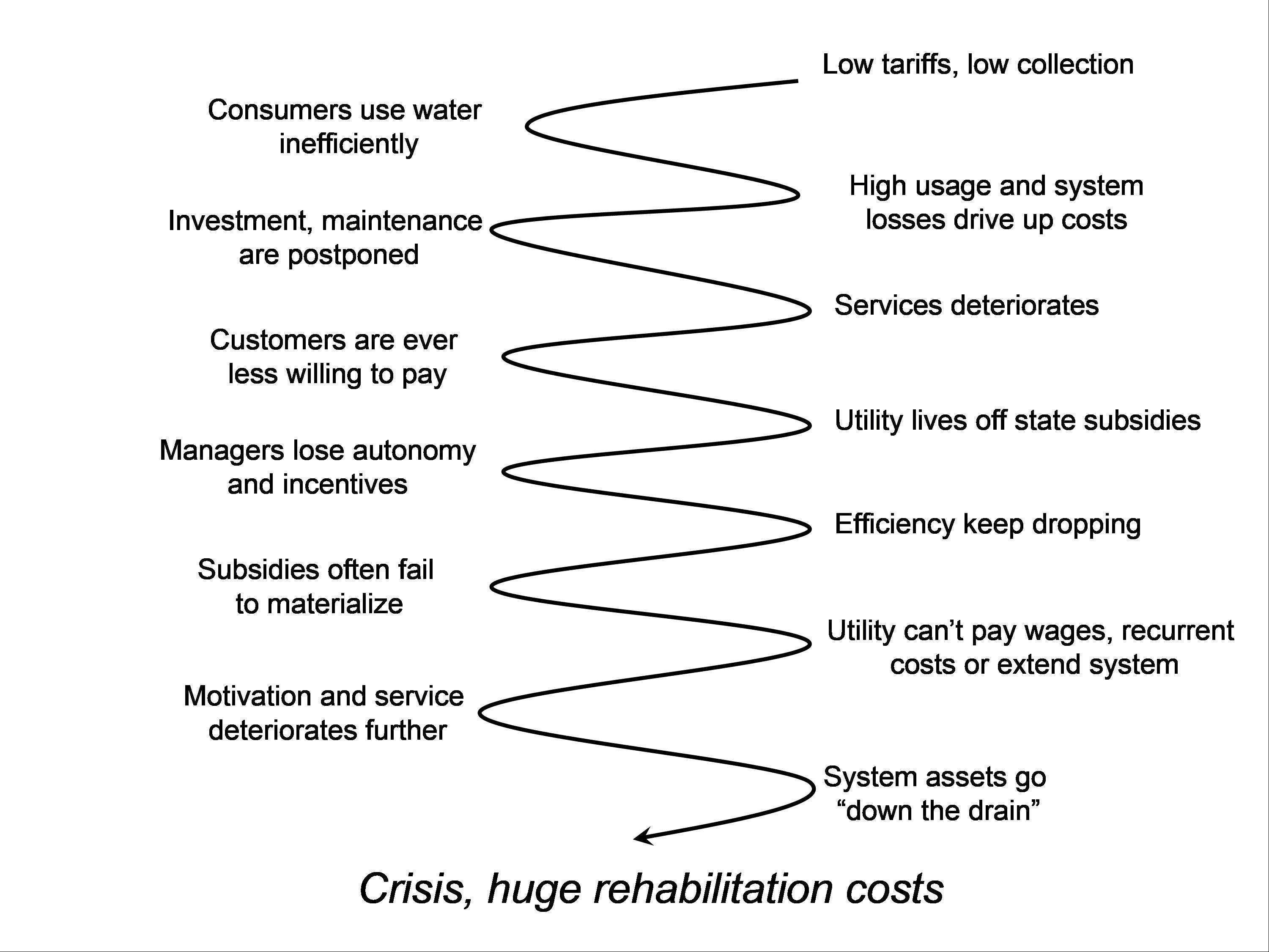 First, many don’t have the capacity to go out to access market finance. So, they are reliant on budgets that their ministries give them. And, often those funds are not only limited but also not reliable. That’s the crux of the problem. As the process goes on, service levels and the utility’s performance deteriorate. It’s a vicious cycle (see graphic below) that continues to worsen to the point where the utility is no longer performing. And any funds that it may receive are mostly going to pay for performance problems rather than providing good service to customers. And when customers don’t feel that they’re getting good value for their money, they stop paying their bills. Or, they exit the system if they can develop their own water substitutes.